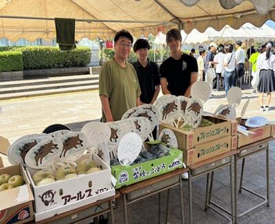 同窓会の皆様には、全校生徒への東風祭うちわの提供、そして中庭で旬のフルーツ販売をしていただきました。それぞれ、利益全くなしの破格の値段で提供でした。本当にありがとうございました。お疲れ様でした。下の写真、皆さんいい笑顔ですね!