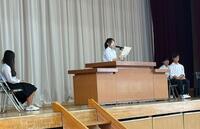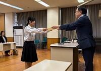 賞状伝達式では、水泳部の北條さん、陸上競技部の針生さん、そして国際理解に関する弁論大会で入賞した吉田さんに賞状をお渡ししました。