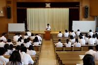 開講式に先立ち、賞状伝達式・大会報告会が行われました。大会報告会では、硬式野球部からの夏の甲子園予選の結果報告に続いき、インターハイ陸上競技男子100Mに出場した新山大翔くん、全国総文祭小倉百人一首かるた部門に出場した板橋留里紗さんから、全国での戦いを終えた感想を交えて結果を報告してもらいました。開講式では、石澤校長先生が夏季休業中のマジック部・JRC・茶道部などの地域貢献活動や運動部の各種大会における活躍を全校生徒に紹介。次に、4月の始業式で話された4つの願い「あいさつしよう・自分自身と周りの人を大切にしよう・新しいことにチャレンジしよう・交通安全(Can see、Can be seen)に努めよう」を継続して欲しいとのお話がありました。