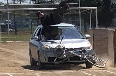 時速40kmで走行する自動車が止まっている自転車に追突したり、一時停止を無視した自転車が自動車にはね飛ばされたり(下の写真)、生徒の皆さんは実際の交通事故を見ることができました。また、生徒代表が自動車に乗車し、その自動車が自転車と衝突する体験や、自転車が歩行者をはね飛ばす事故も再現していただきました。