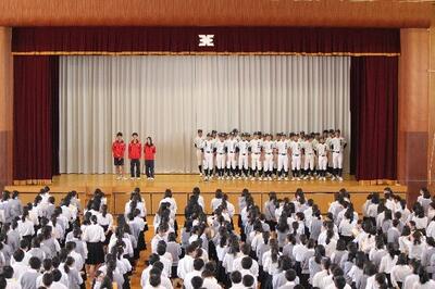 6月6日(木)、県総体報告会、東北大会に出場する陸上競技部3名と甲子園予選に臨む野球部の壮行式を実施しました。今回は校長先生に続き、生徒会長もその思いを歌に込め、これまで頑張った仲間の努力を称え、これから大会に臨む選手たちを激励しました。陸上競技の東北大会は秋田県立中央公園陸上競技場で開催されます。また、6月21日(金)から県総体水泳(競泳)競技がグランディ21プールで開催されます。