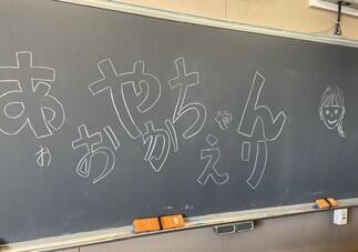 英語科のある担任の先生が、事情があり数日の休暇を取ることになりました。そして休暇が明け、本日より出勤したのですが、朝のホームルームで教室に行くと、黒板に「〇〇ちゃんお帰り」と大きく書かれてあったそうです。先生の似顔絵もかわいいですね。その先生は、生徒ともよくコミュニケーションをとる心優しい先生です。とてもうれしそうにこのエピソードを話してくれました。生徒の皆さんとの信頼関係を大事にしてクラス経営しているその先生はとても素晴らしいと思いますし、この英語科の生徒の皆さんを、担任思いの心優しい素晴らしい生徒だなと感じました。