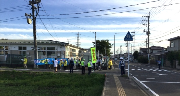 9月26日に,本校近隣の交差点において,六郷交番と交通指導隊さらに交通安全協会の皆様に交通安全の呼びかけをしていただきました。写真はそのときの様子です。